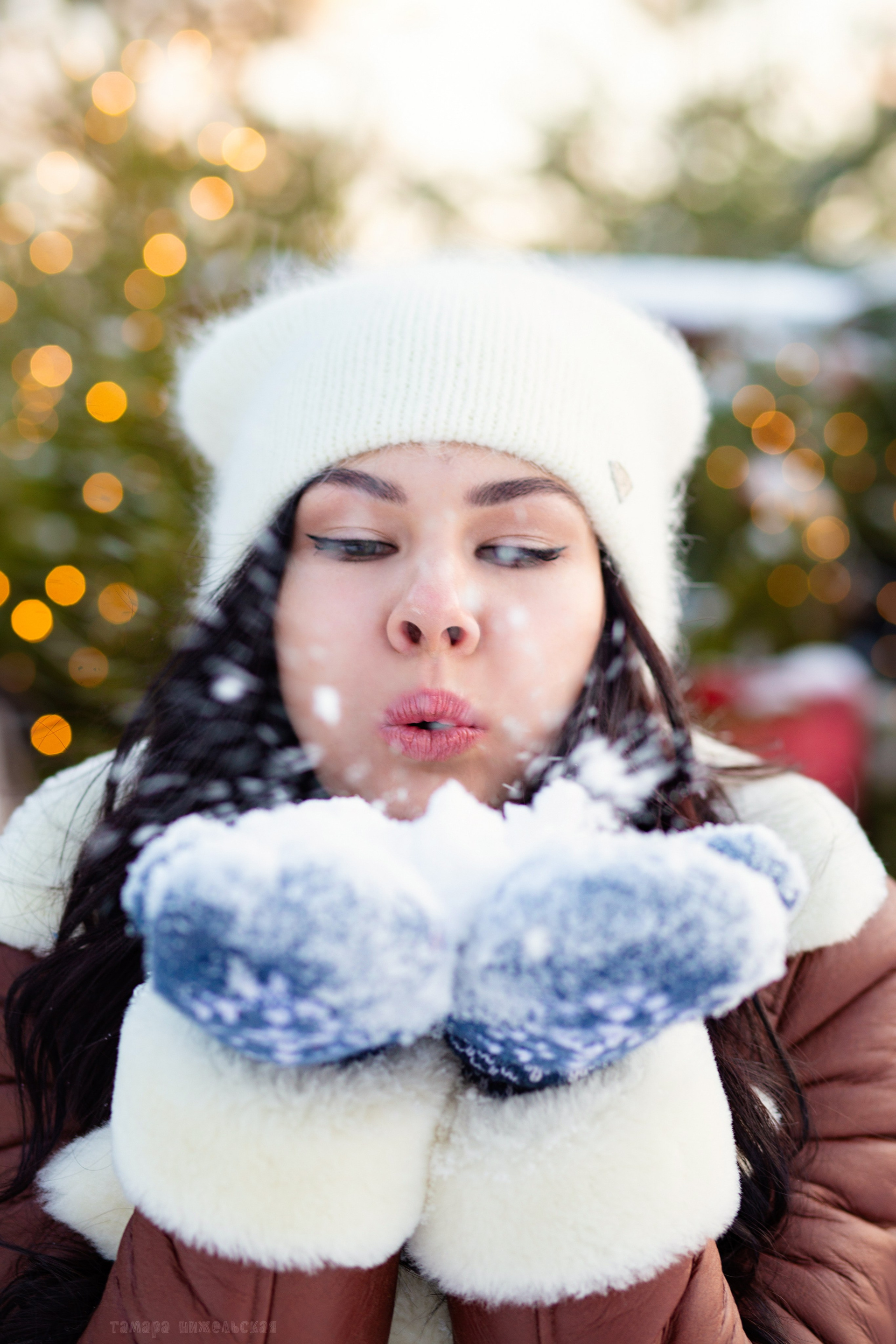 девушка в белой  шапке, коричневой   куртке и синих варежках  держит руки у лица. в открытых ладонях снег. она  дует на  снег. снег  летит  вперёд.