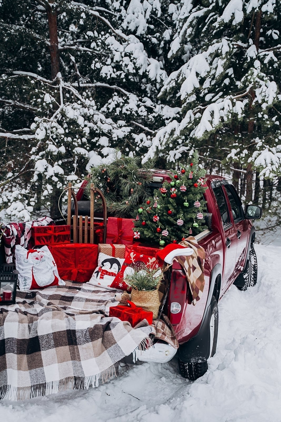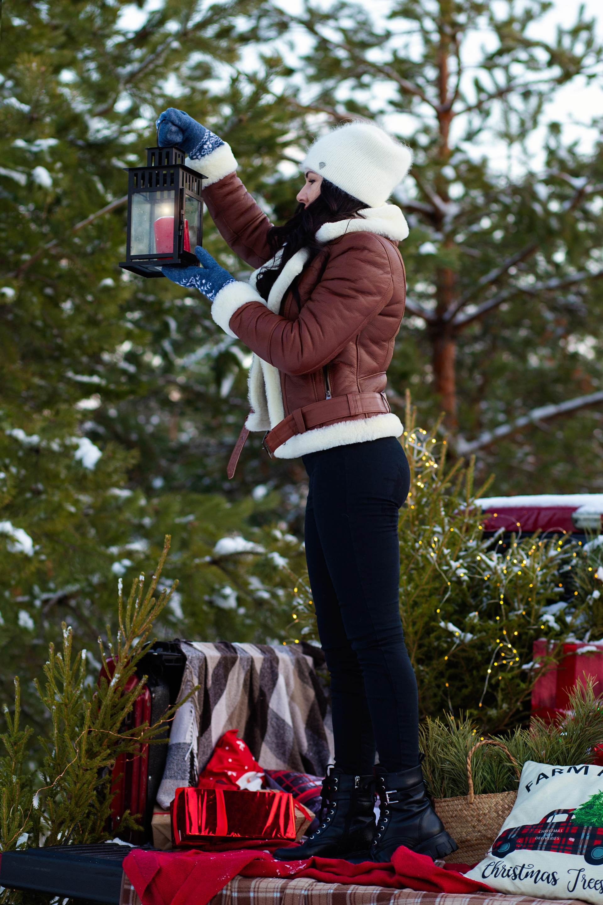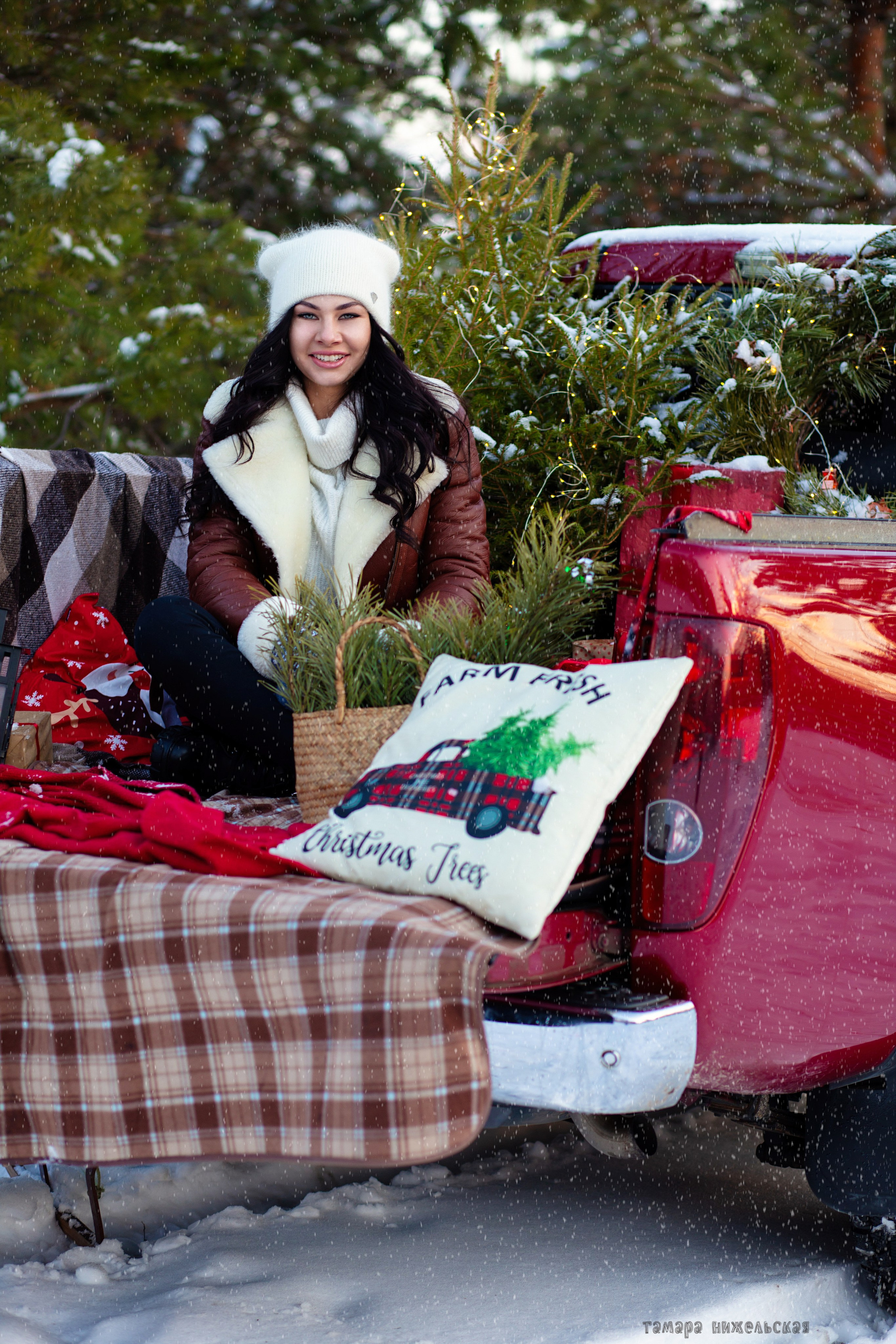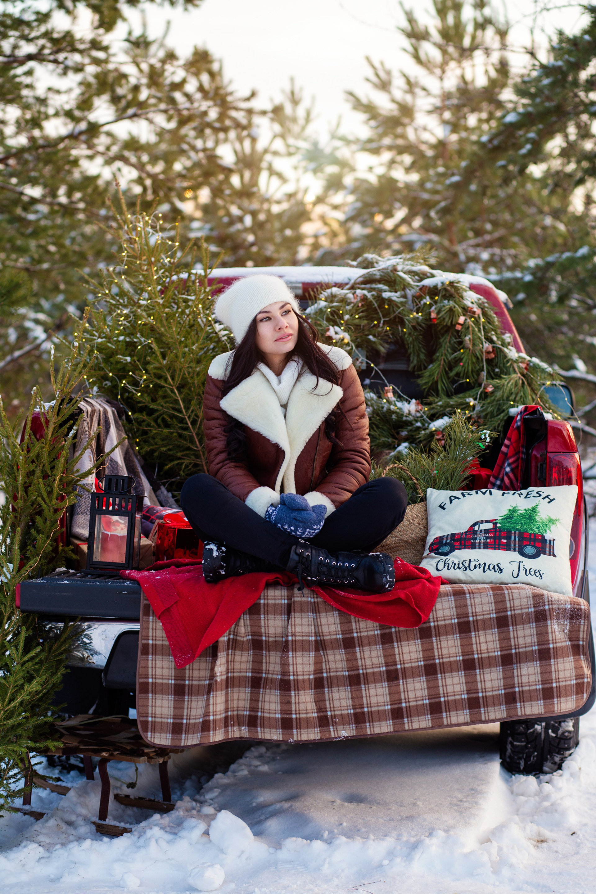 девушка в кожаной  куртке коричневого  цвета    сидит  на   пледе  в  клетку   в машине  пикап красного цвета. у нее в  руках красный подарок. вокруг елки. снег. зима.