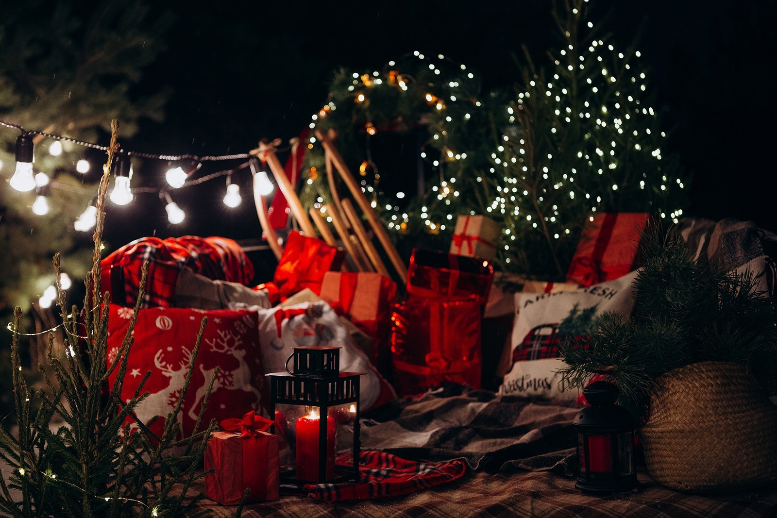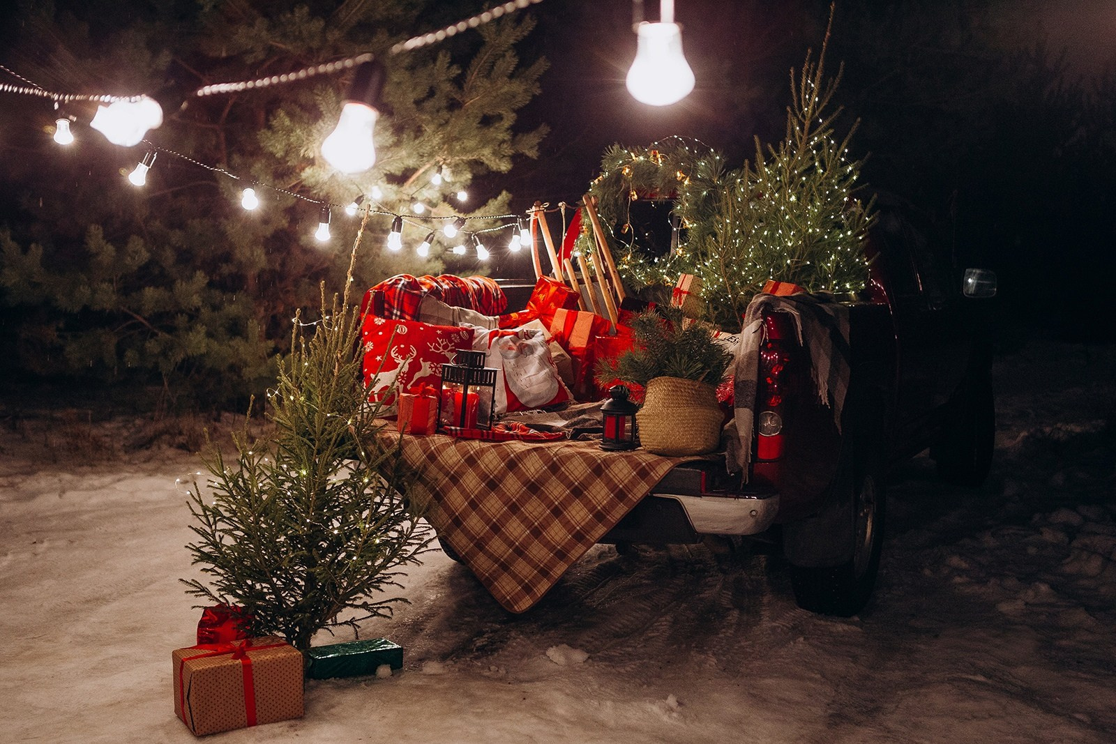 новогодняя выездная фото локация  для всей семьи в  Воронеже. красный пикап, в кузове  елки и подарки. в ночное  время  возле  пикапа гирлянды   и огоньки. яркая локация.