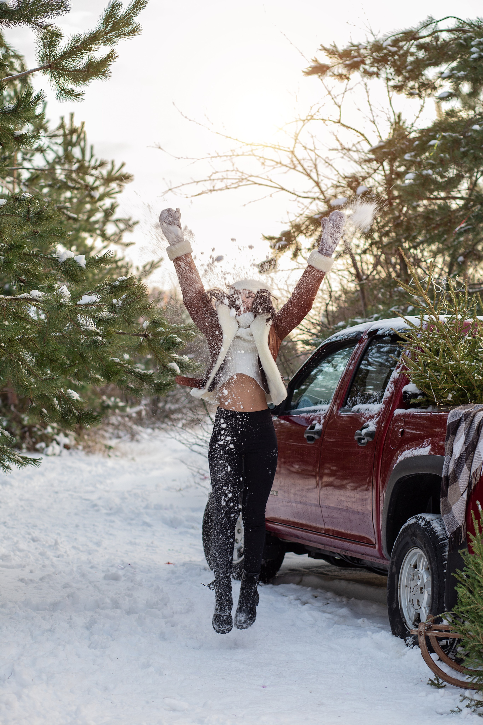 девушка в коричневой  куртке  прыгает, играет со снегом. рядом  стоит красный пикап. зима. снег. закат.